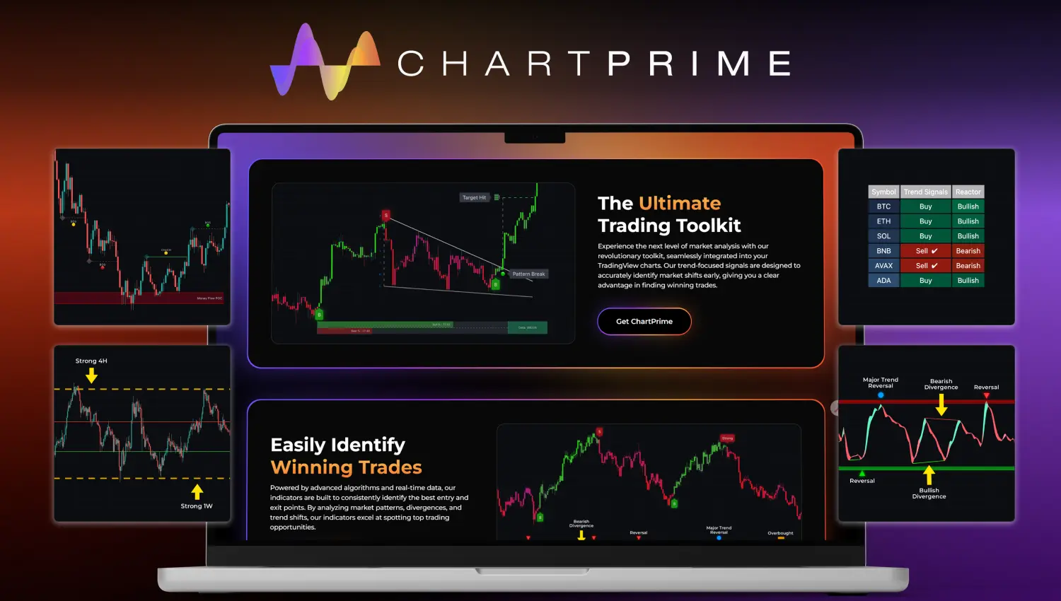 ChartPrime is an advanced trading toolkit that provides AI-driven indicators, smart overlays, and real-time market signals on TradingView to help traders identify high-probability setups and improve decision-making.