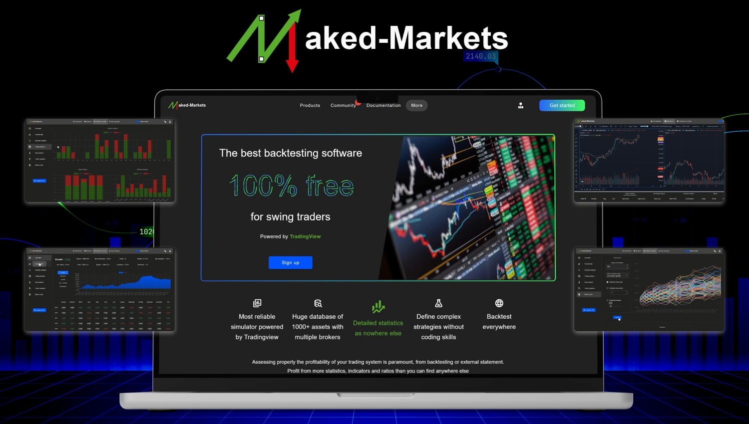 Naked-Markets is a free, TradingView-powered backtesting platform for swing traders that lets you simulate real market conditions across 1,000+ assets, build complex strategies without coding, and analyze detailed performance statistics faster than any other backtesting software.