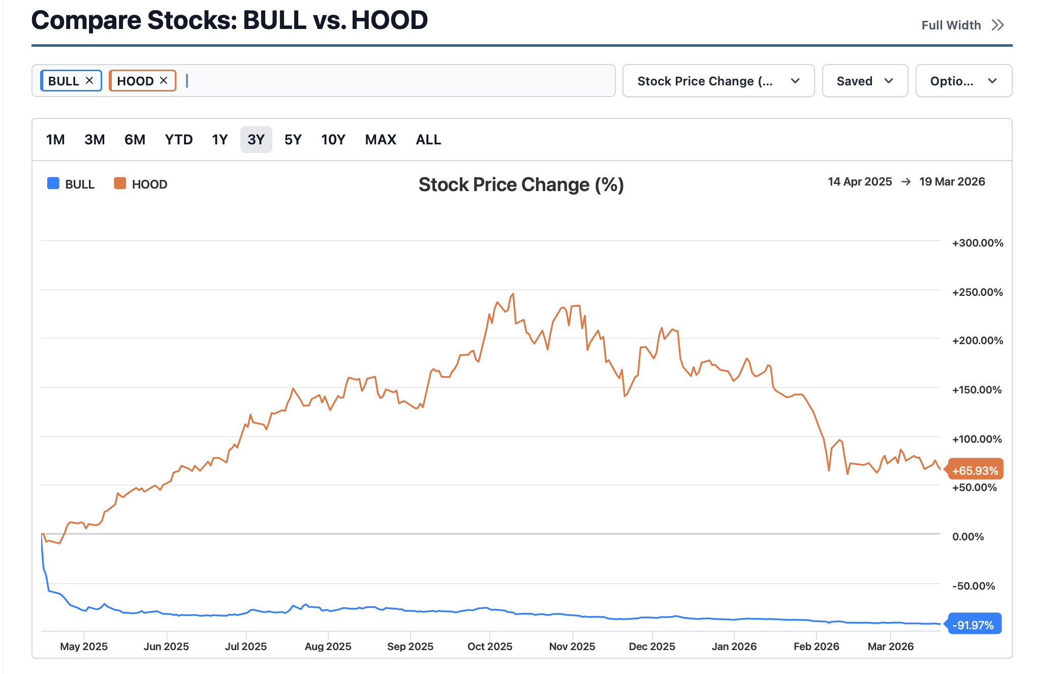 Meanwhile, since its second day of trading, $BULL is down 91%, while $HOOD is up 65% over the same period.