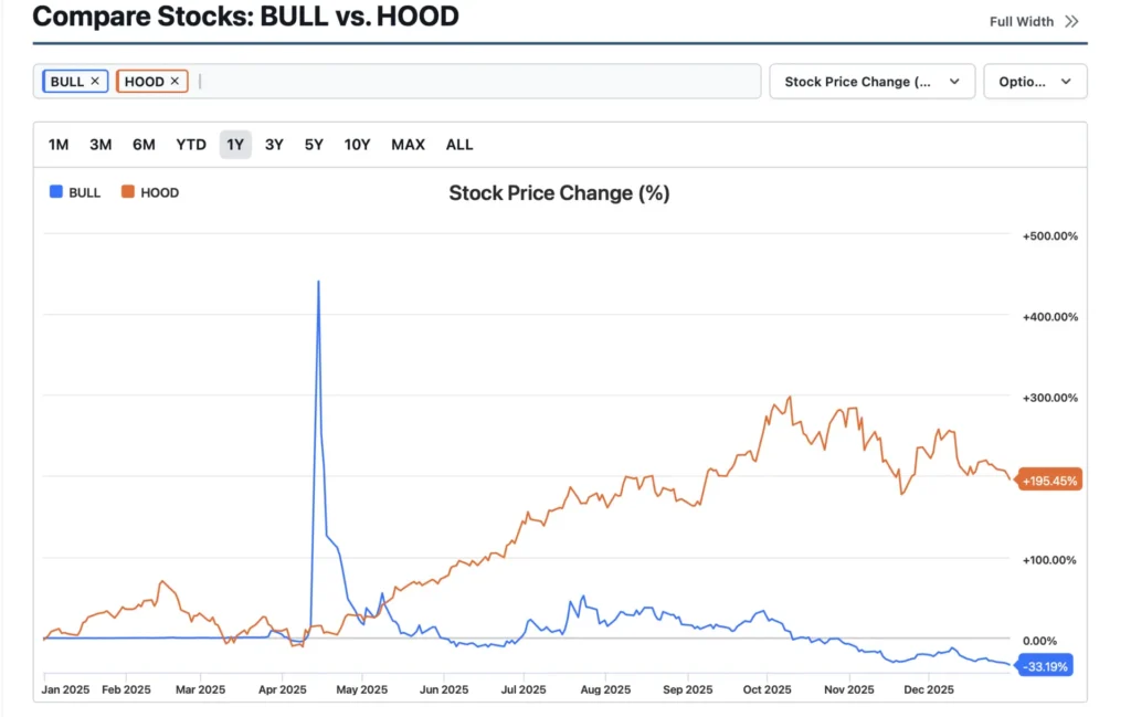 1. The stock was down roughly 33%, versus Robinhood, which was up about 195% over the last year.