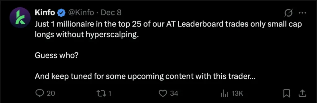 I saw something on Kinfo’s Twitter the other day that pretty much explains why most people lose trading small caps on the long side. Out of their entire top 25 leaderboard, only one small-cap long trader got there without hyperscalping.
